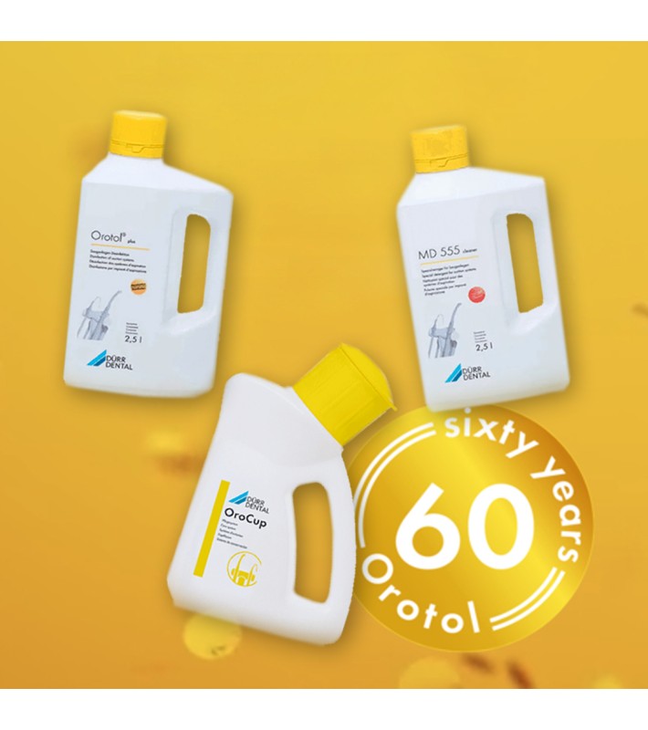 Pentru a marca acest moment, am creat un pachet special: Orotol Plus, MD 555 și OroCup – soluția completă pentru curățarea, dezinfectarea și întreținerea sistemelor de aspirație.