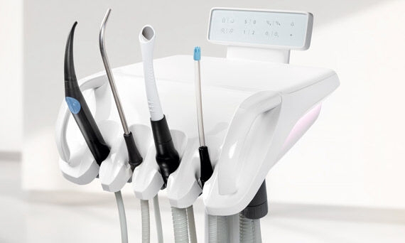 Dispunerea esalonata a suporturilor pentru instrumente permite o prindere ergonomica a seringii, a camerei si a instrumentelor. Este disponibil un raft suplimentar pentru o camera, iar motorul de implantologie are propria conexiune pe partea inferioara a elementului dentistului. |